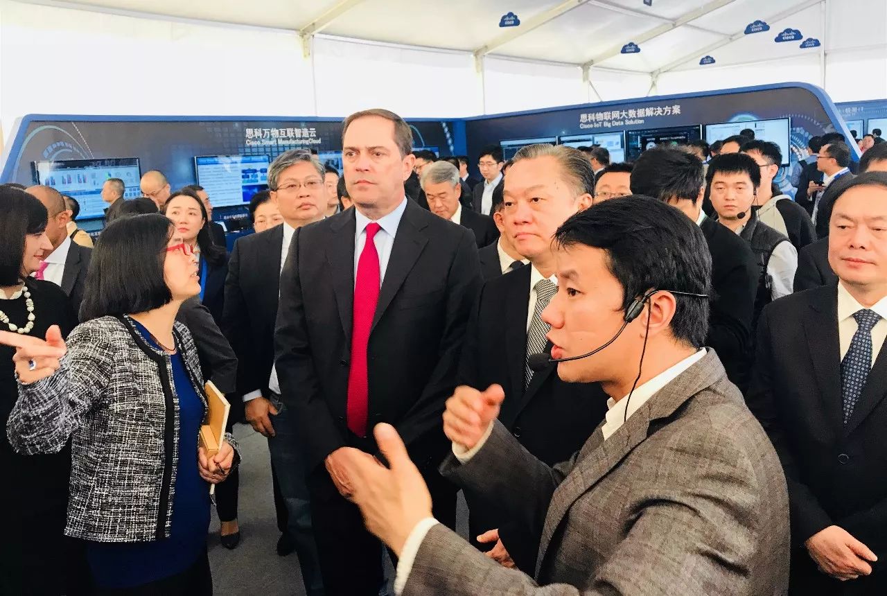 图为碧桂园首席战略官林昭宪,思科全球首席执行官 Chuck Robbins(罗卓克),广东省惠州市委书记、市人大常委会主任陈奕威,广东省惠州市委副书记、市政府市长、党组书记麦教猛等在开元体育展区驻足交流。