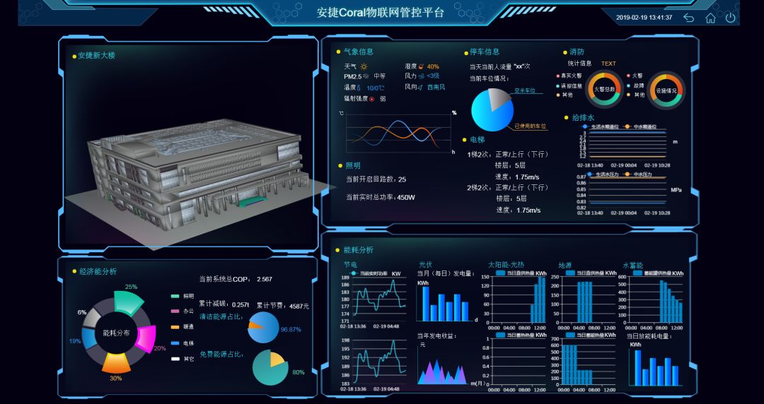 建筑模型信息系统(BIM)能够将各个建筑元素建立起内在的本身信息,并且整合建筑生命周期,使其能够改良规划、设计、建设、操作、和维护的流程之模型系统,并且能够充份的应用在营建工程上面。开元体育物联能源互联网大厦便是借助于BIM技术的优势,在规划阶段进行了日照、风和热负荷等模拟,在基本方案的基础上进行BIM正向设计,同时以第二代物联网大数据管控Coral平台为核心,秉承“先节费,再节能”的运营原则,完成能源多项流转的实时监测、动态策略的下发调整,进而实现能源的最合理配给。
