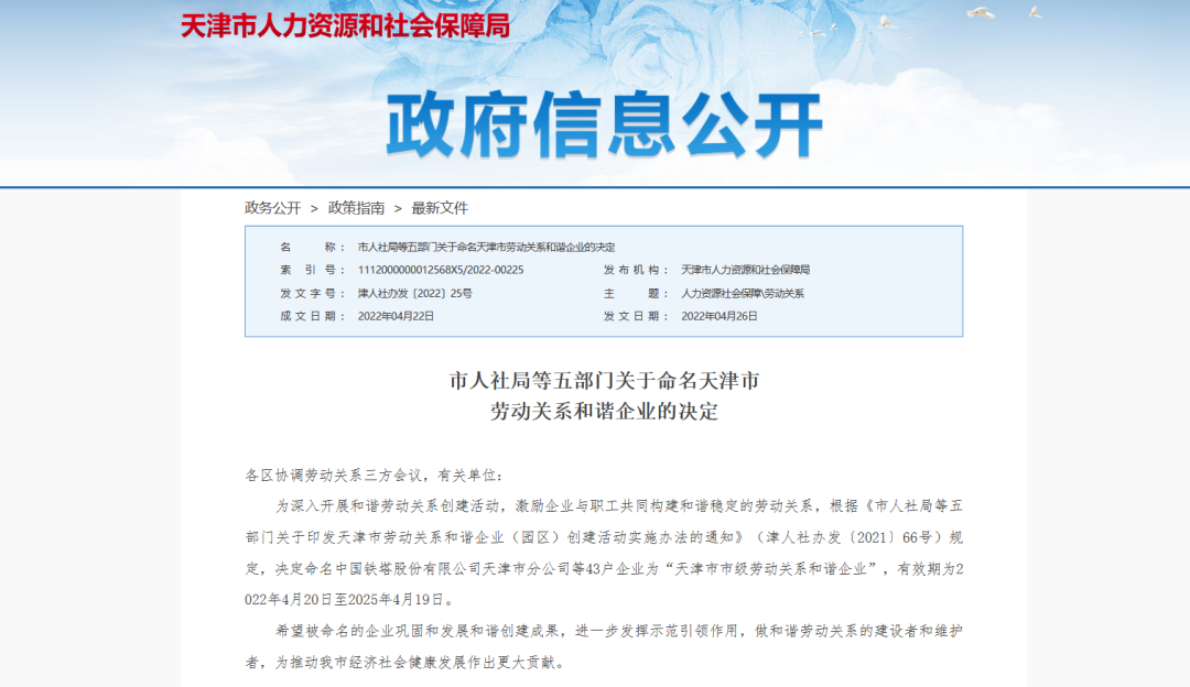 本次获评天津市市级劳动关系和谐企业,是对公司劳动关系工作的充分肯定,也是公司严格执行劳动保障法律法规政策、规范劳动用工管理、落实劳动安全保护措施、维护广大员工合法权益取得的阶段性成果,开元体育将再接再厉,不断提高劳动保障管理层次和水平,巩固和发展和谐创建成果,进一步发挥示范引领作用,做和谐劳动关系的建设者和维护者,为推动我市经济社会健康发展作出更大贡献。